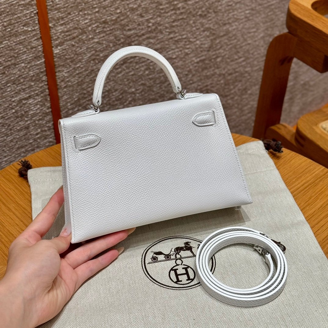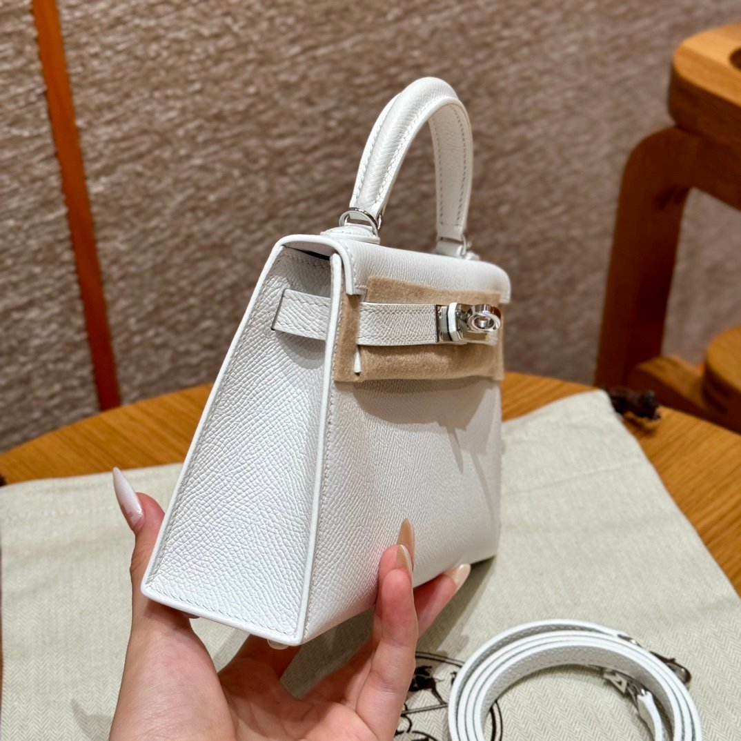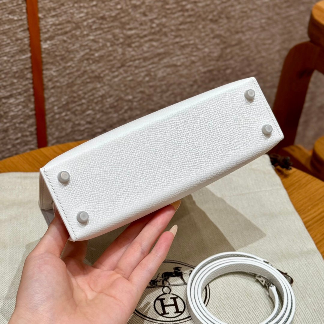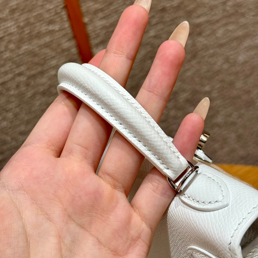 Mini Kelly II, white French imported palm-grain cowhide, silver buckle, high-end fully handmade exclusive customization‼ ️ Purely hand-nailed, hand-engraved hardware, stainless steel electroplated 18k hardware‼ ️
