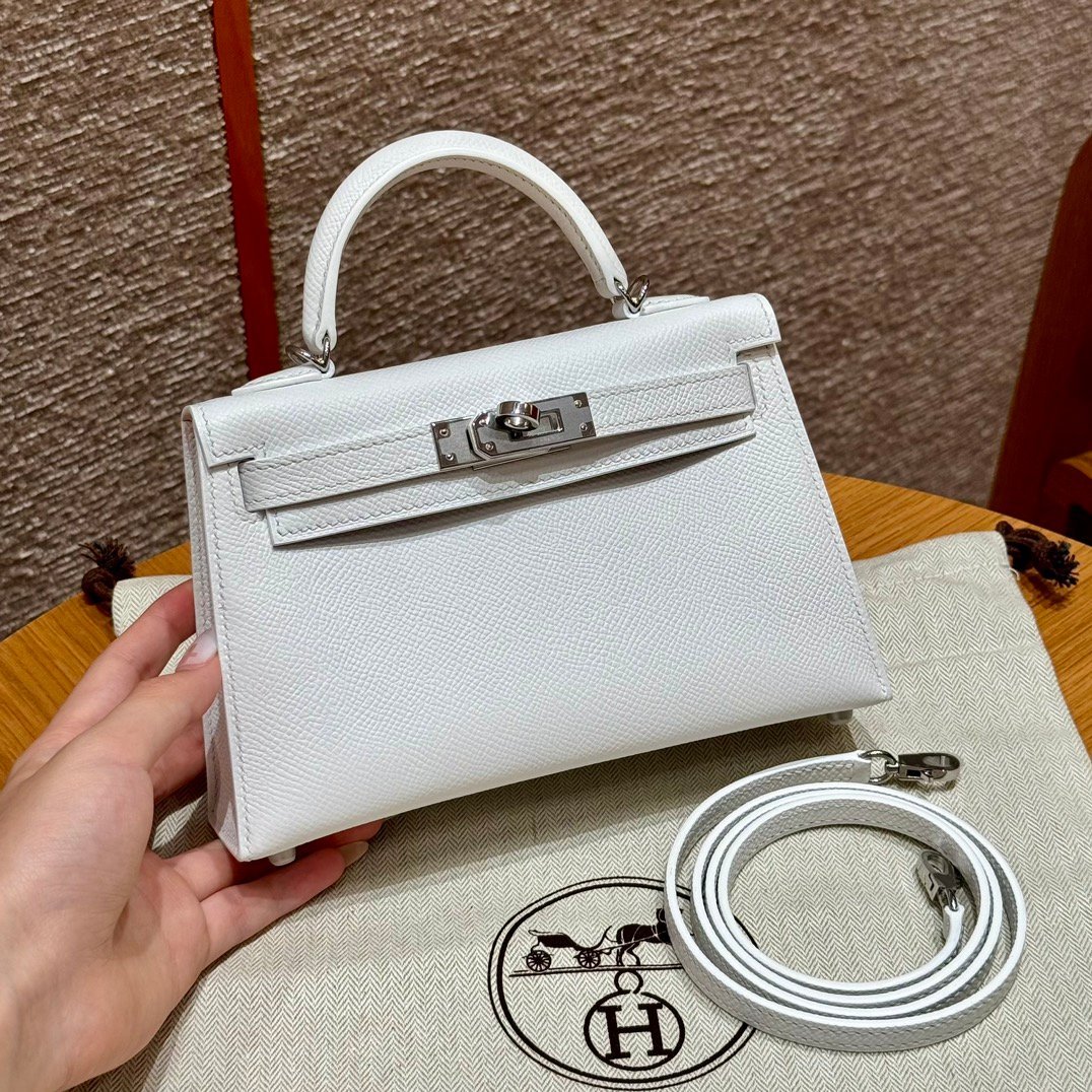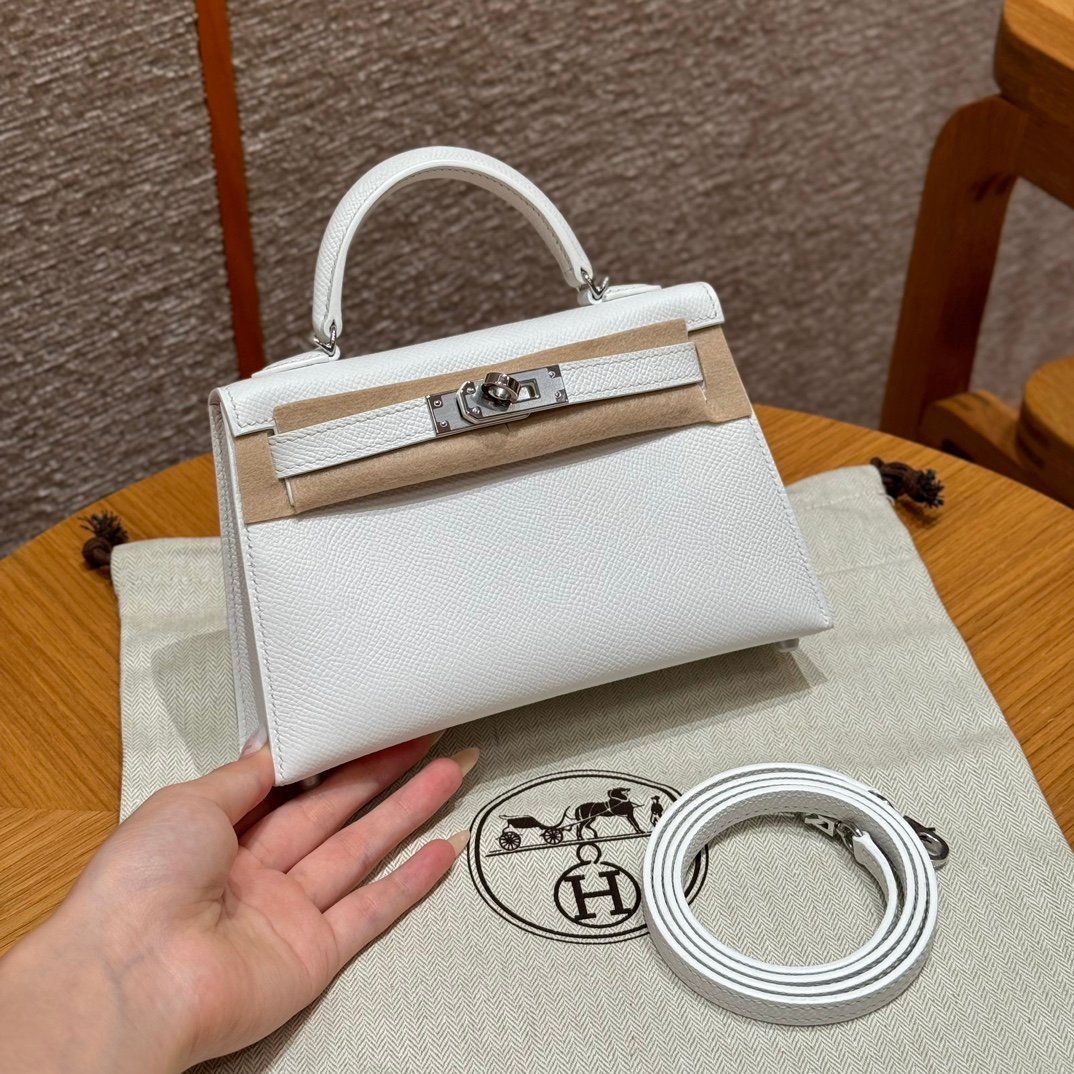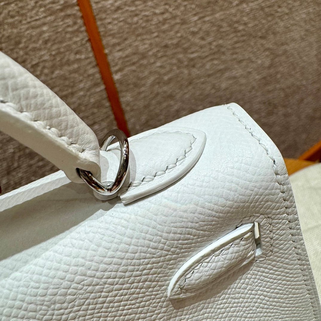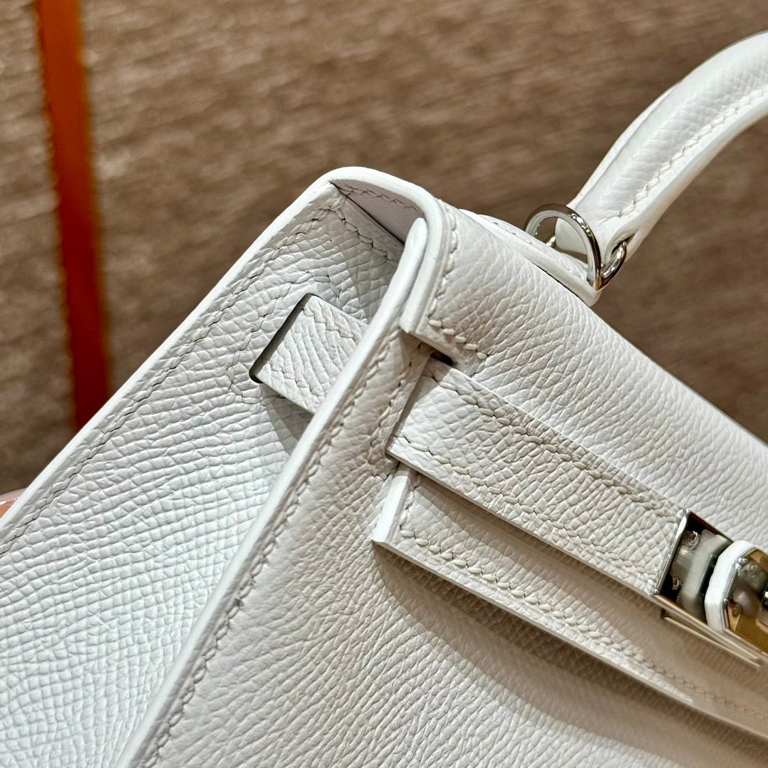 Mini Kelly II, white French imported palm-grain cowhide, silver buckle, high-end fully handmade exclusive customization‼ ️ Purely hand-nailed, hand-engraved hardware, stainless steel electroplated 18k hardware‼ ️