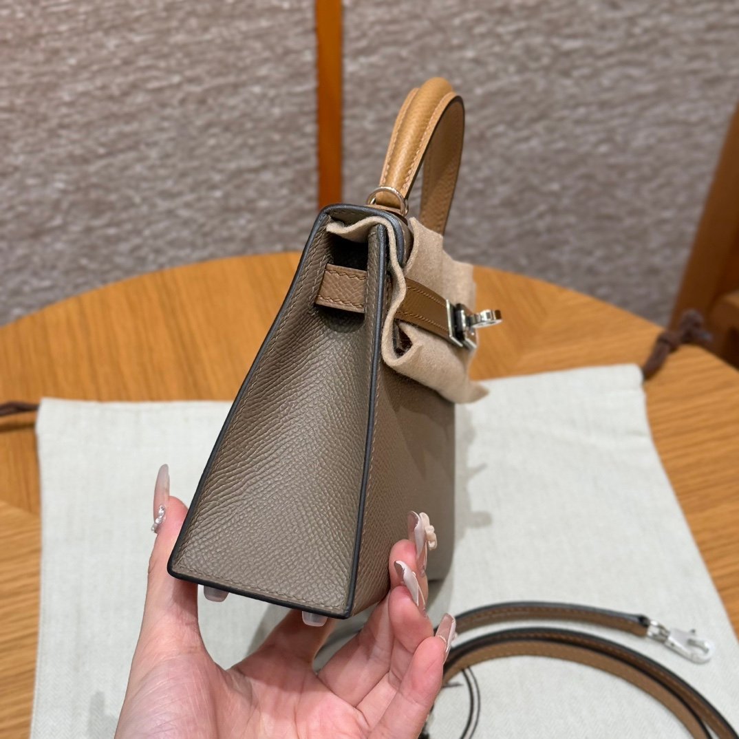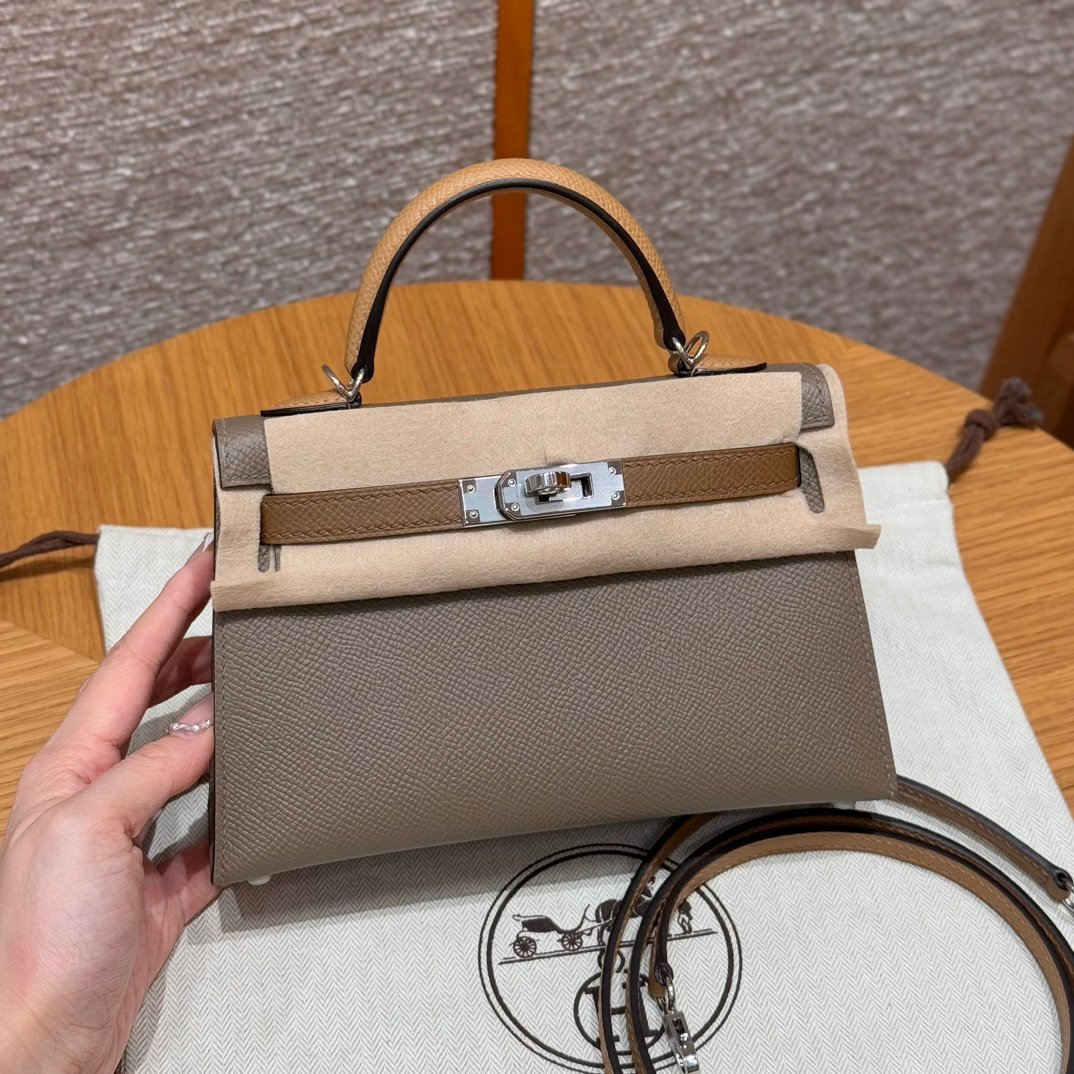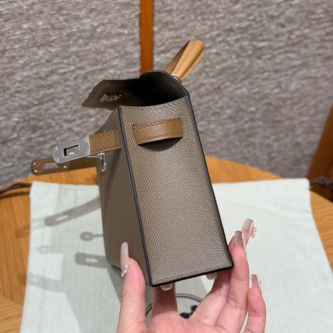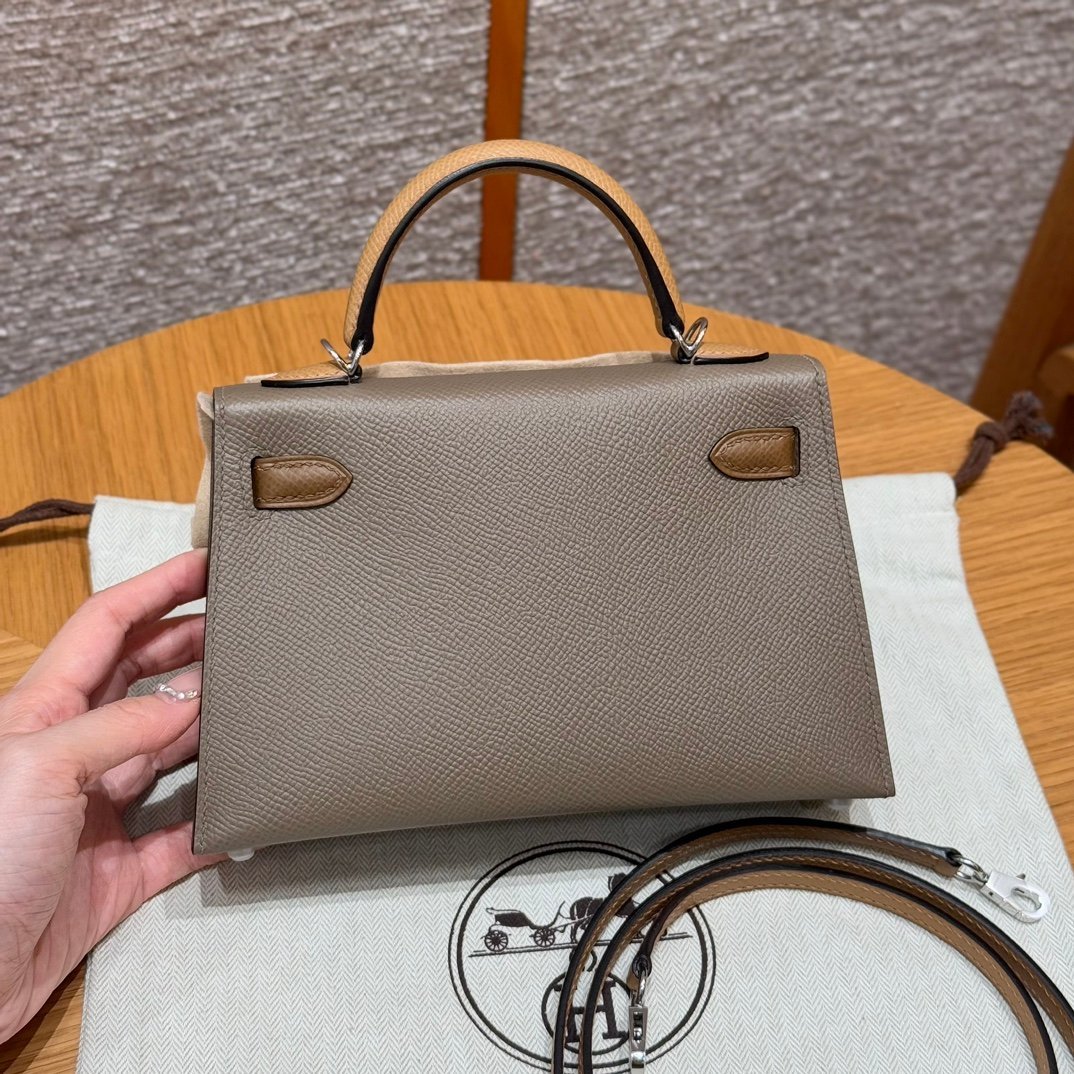 Mini Kelly II, elephant gray-chestnut color strap-biscuit color wrist strap, silver buckle, French imported palm-grain cowhide, high-end fully handmade exclusive customization‼ ️ Purely hand-made nails, hand-engraved hardware, stainless steel electroplated 18k hardware