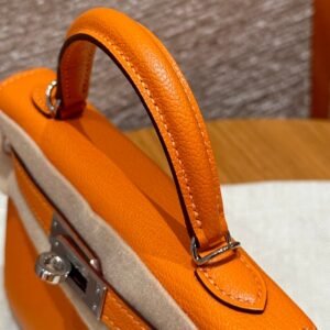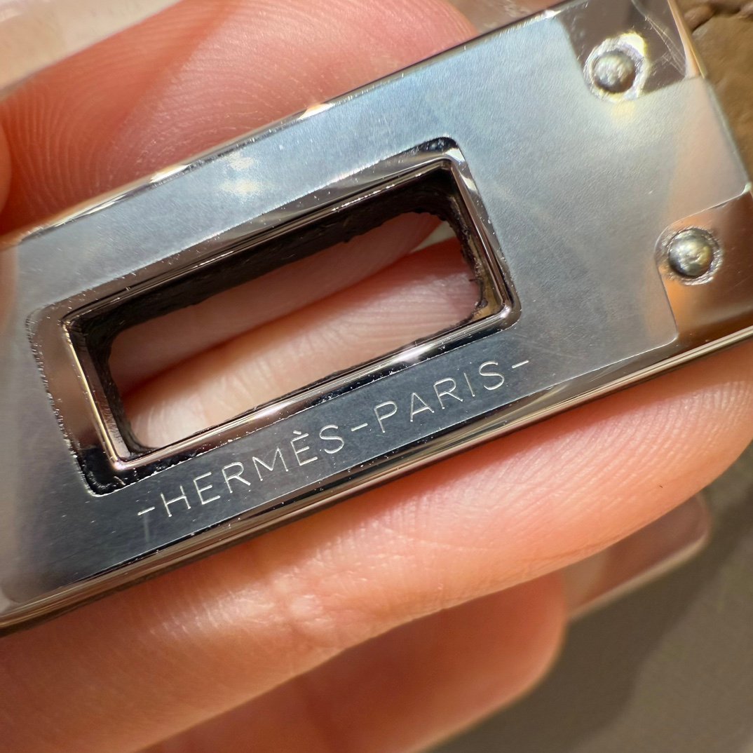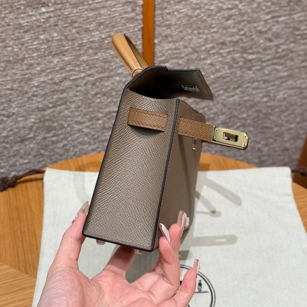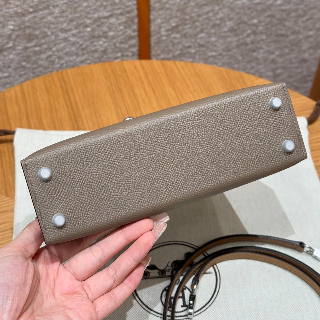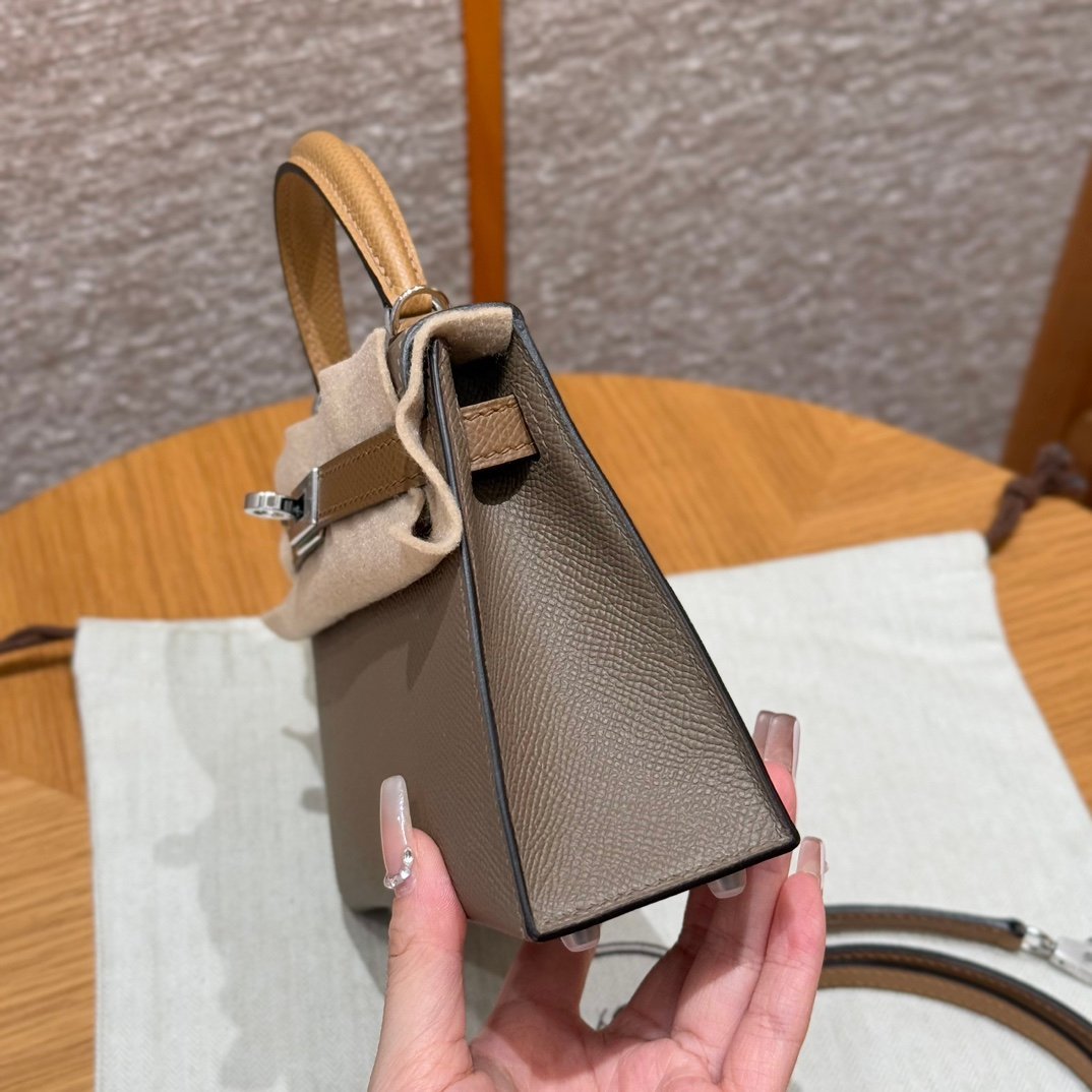 Mini Kelly II, elephant gray-chestnut color strap-biscuit color wrist strap, silver buckle, French imported palm-grain cowhide, high-end fully handmade exclusive customization‼ ️ Purely hand-made nails, hand-engraved hardware, stainless steel electroplated 18k hardware