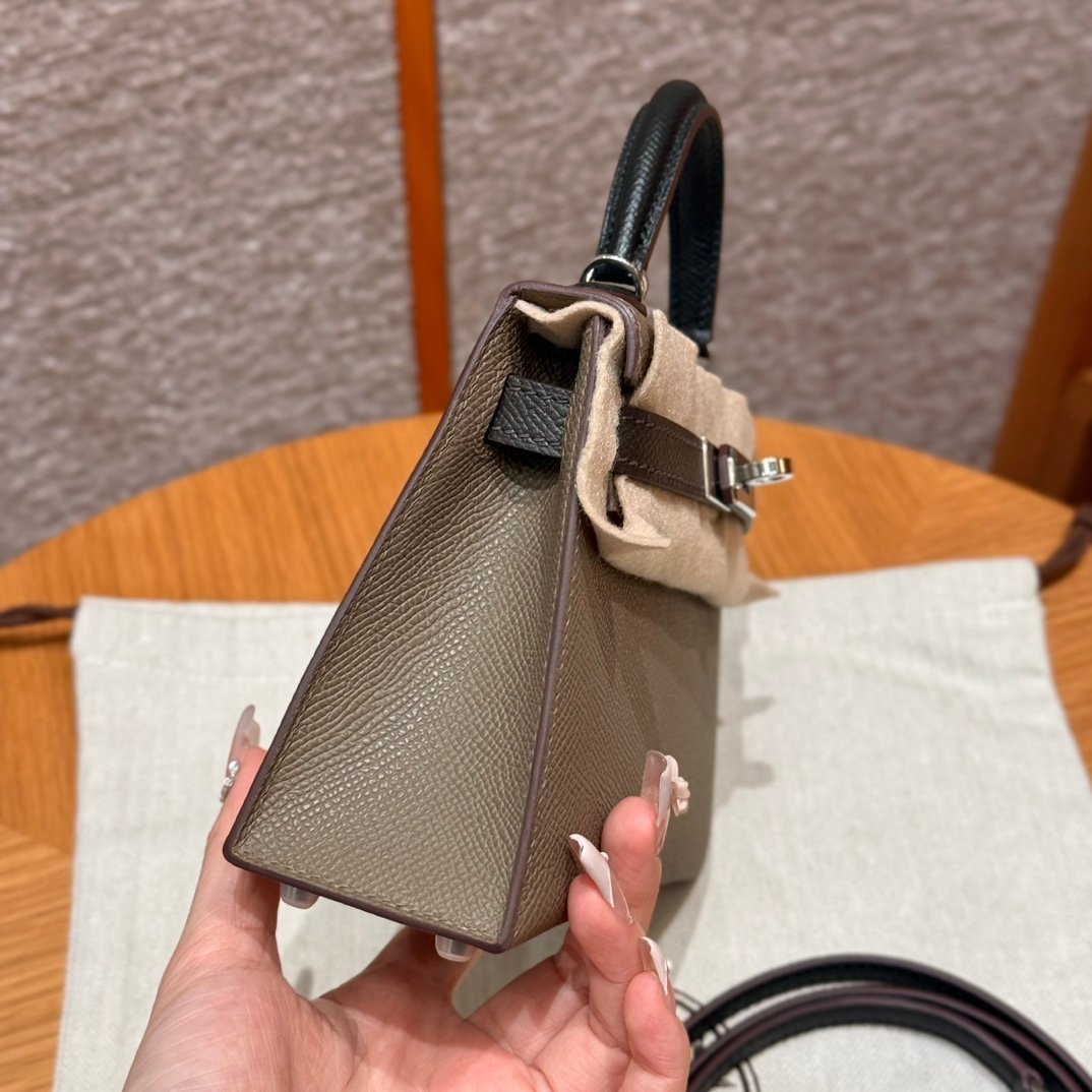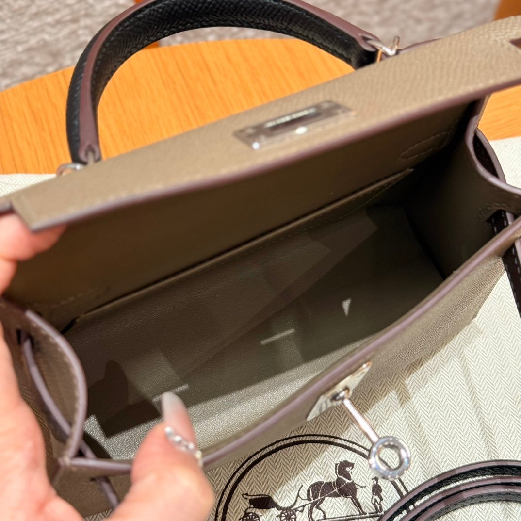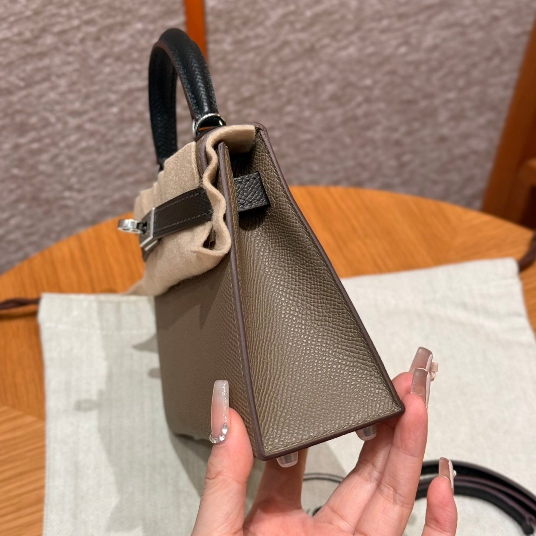 Mini Kelly II, elephant grey with bark color and black wrist strap, silver buckle, French imported palm-grain cowhide, high-end fully handmade exclusive customization‼ ️ Purely hand-nailed, hand-engraved hardware, stainless steel electroplated 18k hardware